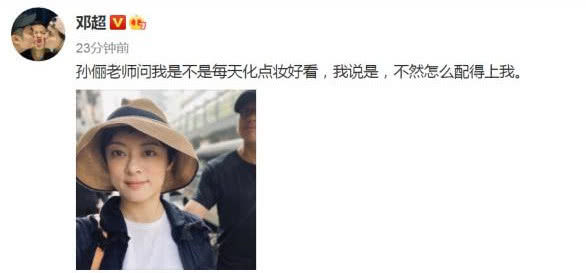 10月9日许久没有秀恩爱的邓超晒出了二人的合照,还配文写道:“孙俪老师问我是不是每天化点妆好看,我说是,不然怎么配得上我。”言语间还是以往的搞笑画风,照片中孙俪五官精致头戴渔夫帽,反而是后面的邓超显得白发苍苍,状态明显赶不上娘娘。