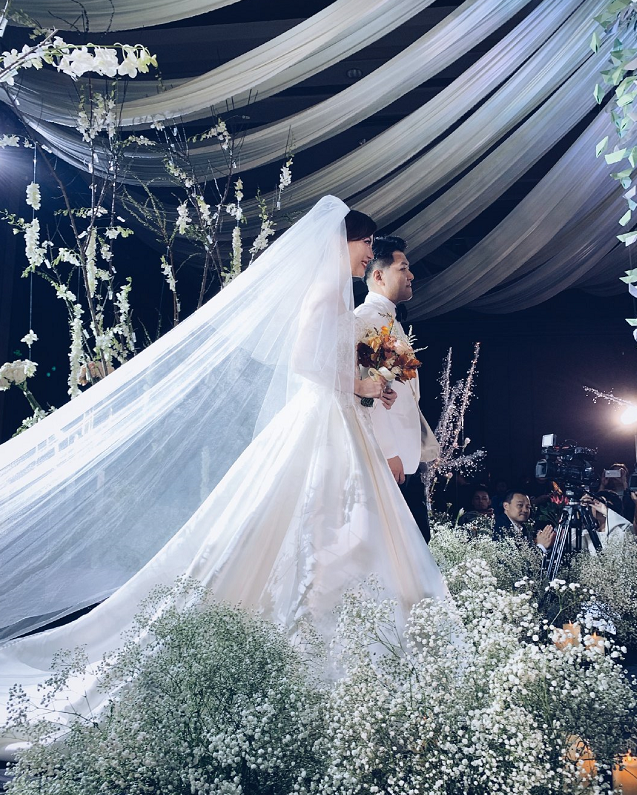 婚礼现场特别大,他们还特意制作了一面照片墙,上面全都是新郎新娘的结婚照。