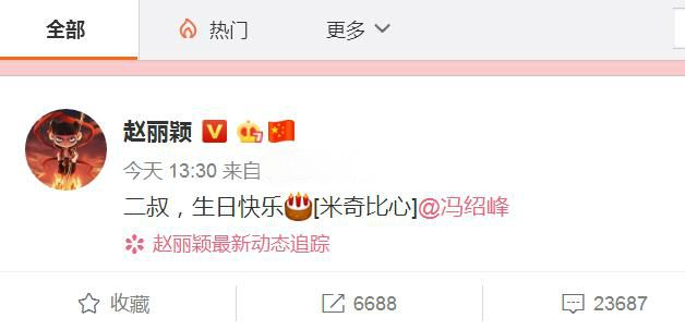 而就在10月7日,冯绍峰41岁生日来临之际,已身为人妻的赵丽颖首次发博公开向冯绍峰庆生,在微博中,赵丽颖这样写道:“二叔,生日快乐!”众所周知,在电视剧《知否知否应是绿肥红瘦》热播之时,网友就对冯绍峰以“二叔”相称,而如今赵丽颖向冯绍峰庆生时同样以“二叔”相称,明显又在秀恩爱。
