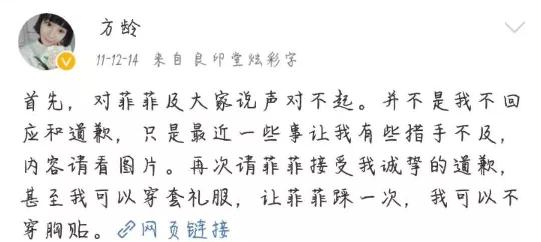 而主持人方龄在此事过后也通过微博,发文向孙菲菲诚挚地道歉,称“我可以穿套礼服,让菲菲踩一次,我可以不穿胸贴”,可这话总感觉有种挑衅的味道。