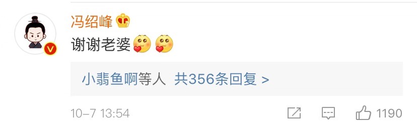 冯绍峰也回复赵丽颖的祝福,谢谢老婆。