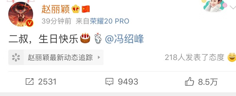 今天冯绍峰41岁生日,赵丽颖可能无法给老公亲自庆生,因为正在拍摄《有翡》,赵丽颖发文说“二叔,生日快乐”,看来没有走出他们主演的《知否》,赵丽颖因为这部戏,一直习惯叫冯绍峰“二叔”,这真是人生如戏,戏如人生,不知道现实生活中的冯绍峰会叫赵丽颖什么,老婆,还是明兰,或者是丽颖?