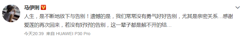 10月6日晚,马伊琍在社交平台上发文称:“人生,是不断地放下与告别!遗憾的是,我们常常没有勇气好好告别,尤其是亲密关系…感谢爱莲的再次回来,若没有好好的告别,这一辈子都是解不开的结…”引起了网友热议,似乎是在借助剧中的情节来发出自己的心声,没有勇气好好告别。