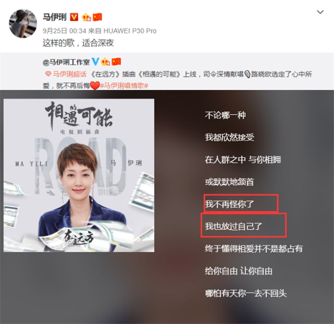 在此之前马伊琍曾经在社交平台上宣传新剧的时候放出了自己为电视剧的插曲,其中歌词上也曾写道“我不再怪你了,我也放过自己了,给你自由,我还是爱你的”引起了网友的阵阵心疼,被许多网友认为是借助歌词表露心声。