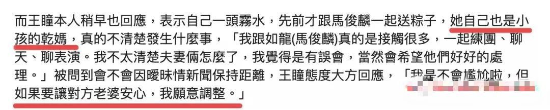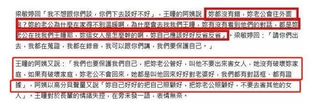 而王瞳一开始也说自己是马俊麟和梁敏婷儿女的干妈,怎么可能会做对不起他们事情,并说自己不会尴尬,一副坦荡荡的样子。