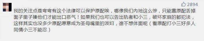 这个操作简直是正室的福音,不过也有网友觉得这个法律有缺点,如果女方是被男方骚扰侵害,而男方的老婆还反过来控告女方的话,那这个女生就很冤枉了。