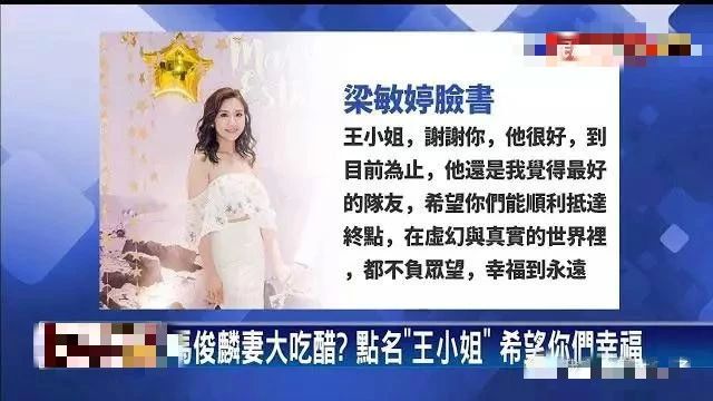 而今年6月份,梁敏婷在社交软件上接连发表一些关于感情生活很伤感的言论,其中一条内容直接点名“王小姐”,称自己才是马俊麟的“最佳队友”,希望“王小姐”能幸福到永远。