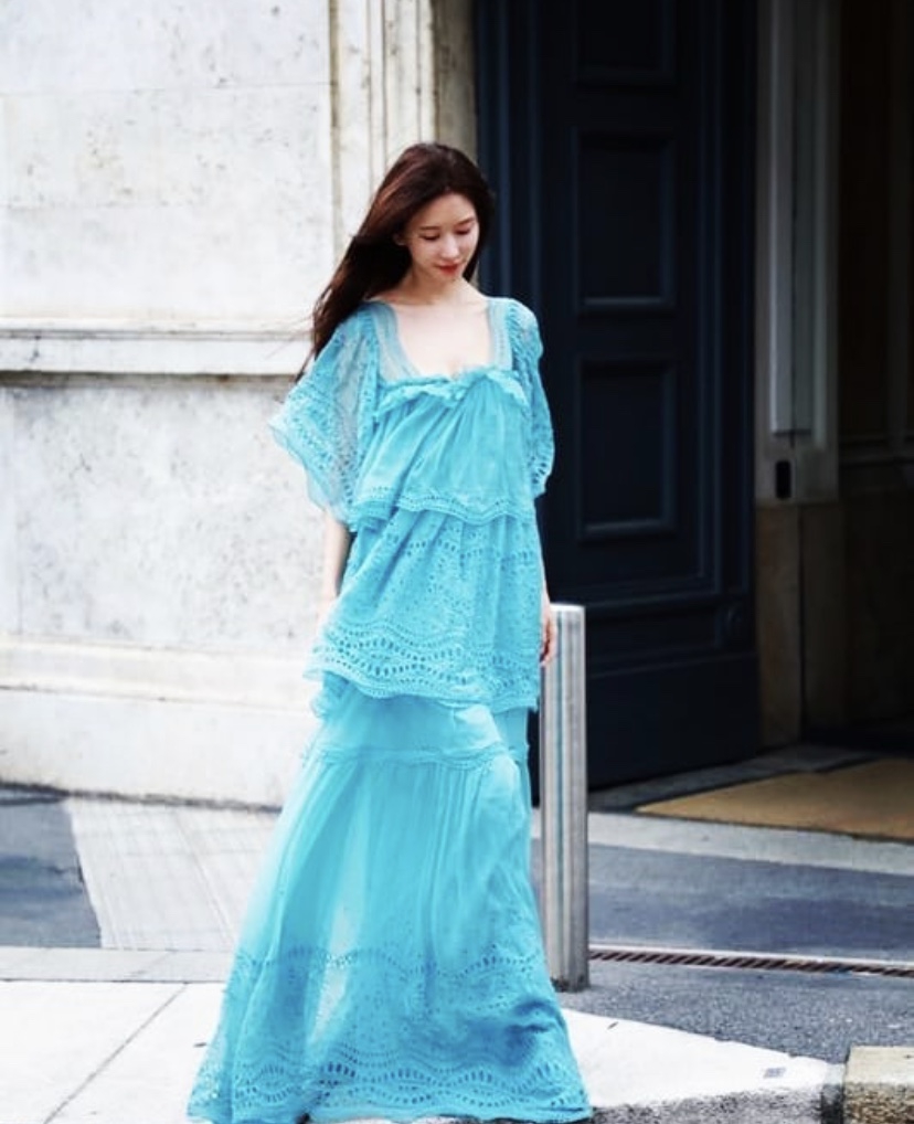 林志玲身着蓝色长裙,裙子的款式看着像睡裙,飘逸优雅,林志玲仙气十足,同时也显示出她高挑的身材。最近看到林志玲的近照,总感觉她的容貌越来越年轻,更主要的感受是变了个样子。