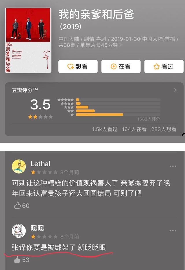 今年上了一部电视剧,《我的亲爹和后爸》的男一号!结果三观太烂,只有3.5分……