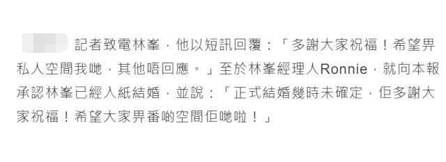 结婚消息曝光,港媒联络林峯及其经纪人,因为连拟结婚通知书都公开了,两人不得不承认此事,不能像之前那样,回避所有的传言。