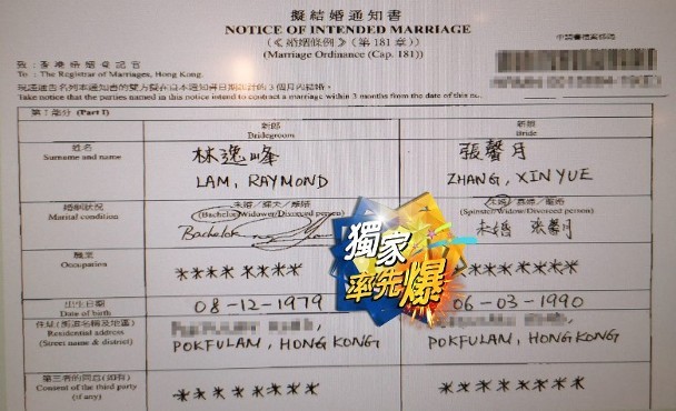 10月5日凌晨,港媒报喜讯,林峯与女友张馨月的拟结婚通知书曝光了,两人已经正式申请结婚,根据规定,他们于申请日期的15天之后,3个月之内,可以正式注册结婚。