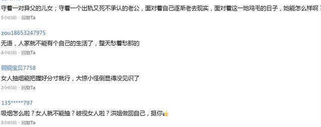 其实即便洪欣作为女星或者人妻人母要吸烟,也很正常,毕竟吸烟的女人不少,人妻人母女星被拍到吸烟的也很多,所以没必要大惊小怪。只是很多时候吸烟不仅仅是过瘾,有时候也是为了排解寂寞或烦恼,所以洪欣吸烟被拍到而被关注,不仅仅是因为姿势娴熟,还因为满脸愁容,这让人有些意外好奇。