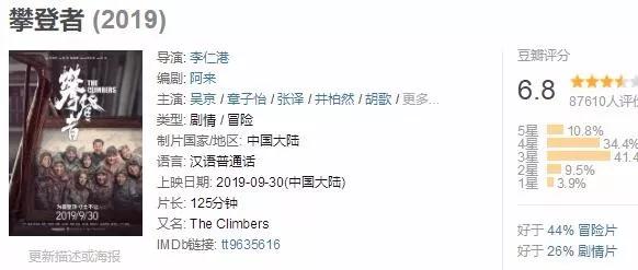 《攀登者》根据中国登山队两次登顶珠峰的真实故事改编,是一个好题材,《攀登者》拍出了登山过程的艰辛和冒险,整个过程紧张刺激,动作戏也看点十足。