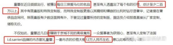 且据当时某时尚媒体的报道,《断刺》播出后,童蕾每日三换爱马仕名品,有很多还是限量版和特殊定制版,总计200万以上。并且辗转于不同的北京高级寓所。甚至还有人定制了一套12万元的内衣博美人一笑。