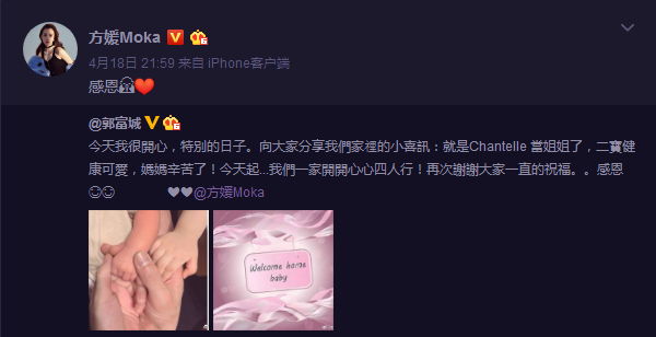 方媛在2017年3月跟郭富城结婚,同年9月生下大女儿Chantelle。而在今年4月,郭富城在社交平台宣布诞下二胎女儿,并表示:我们一家开开心心四人行。