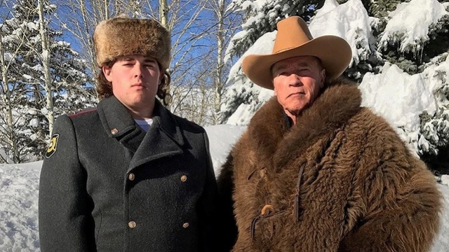 施瓦辛格与身穿俄罗斯警服的儿子合影