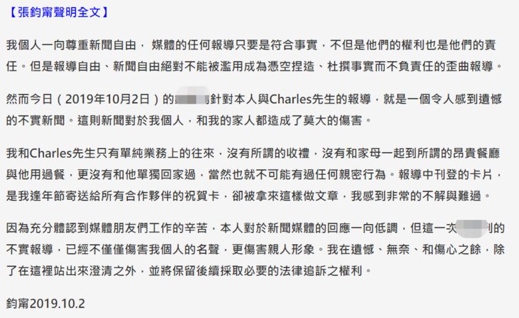 对此,张钧甯工作室否认曾和这位品牌高层暧昧,之后张钧甯本人也在社交平台发布长文否认了曾经和这位高层搞暧昧。她表示这样的消息,对自己和家人都造成了很大的伤害,自己和这位高层只是业务上的往来,从来没有暧昧,没有一起吃饭,更没有到对方家中喝红酒。至于增速的卡片,当时自己给所有的合作伙伴都送了,被对方拿来做文章感到非常难过。