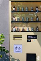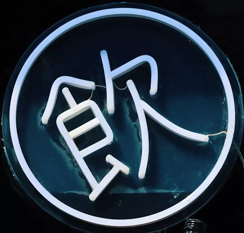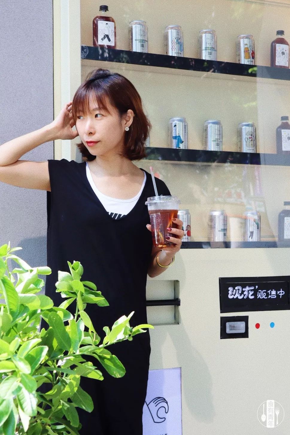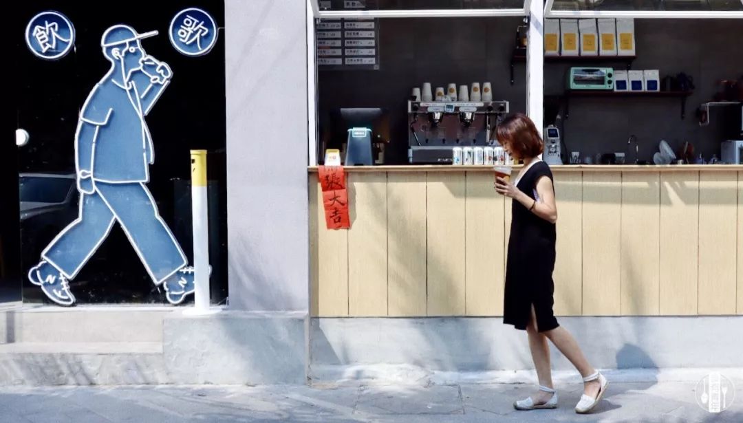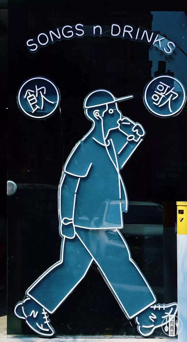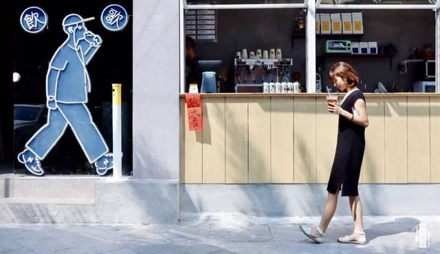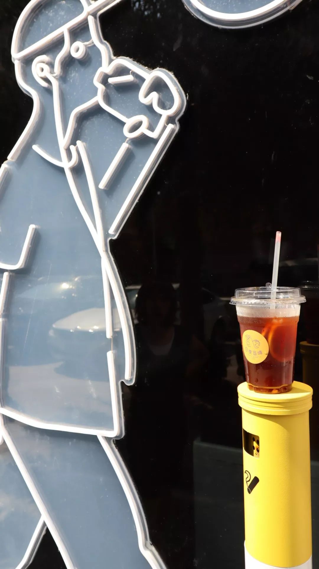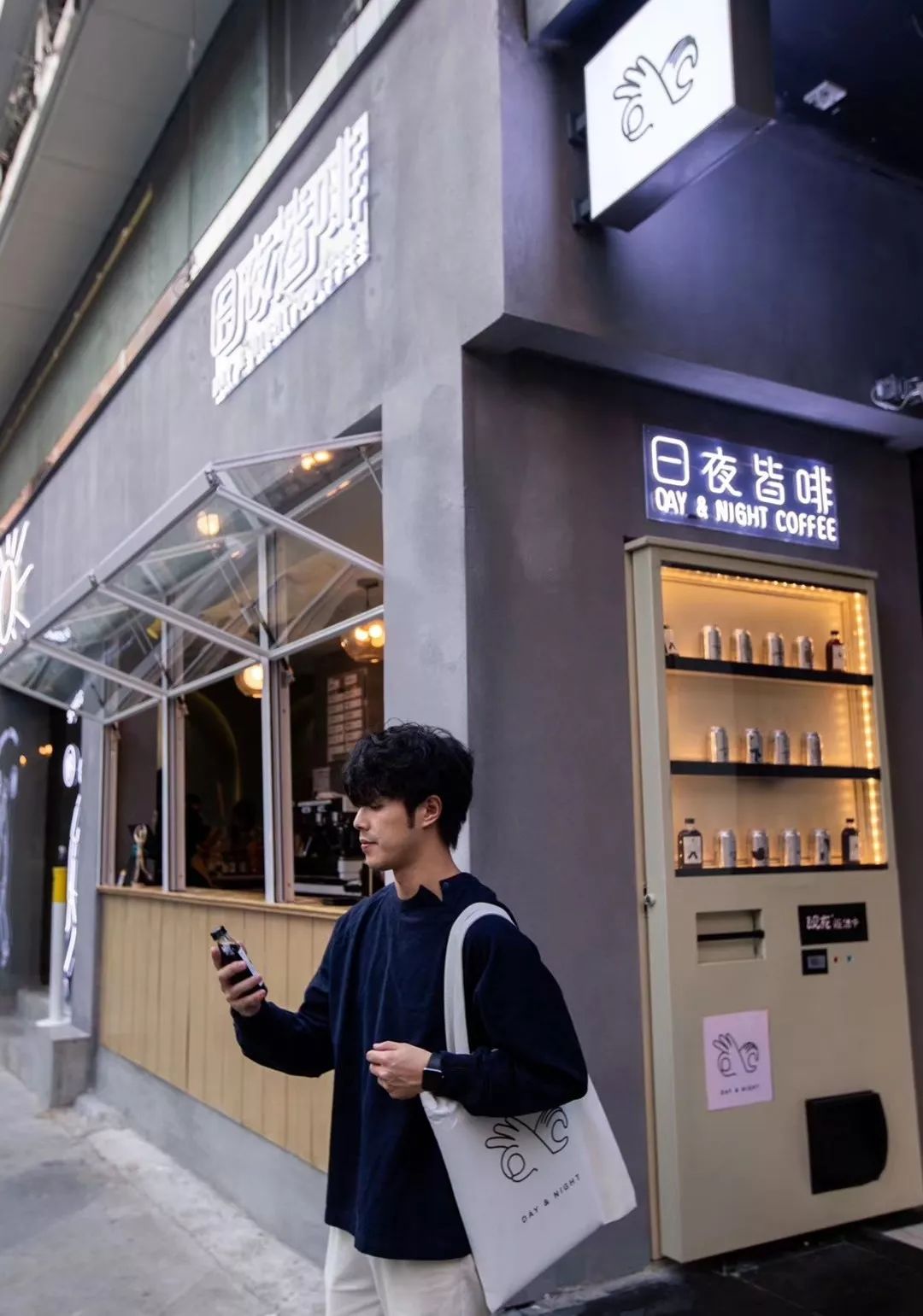拐角一台黄色自动售货机,摆着正在贩卖的啡饮。入口是不透光黑玻璃,画着听歌带帽行走少年。
