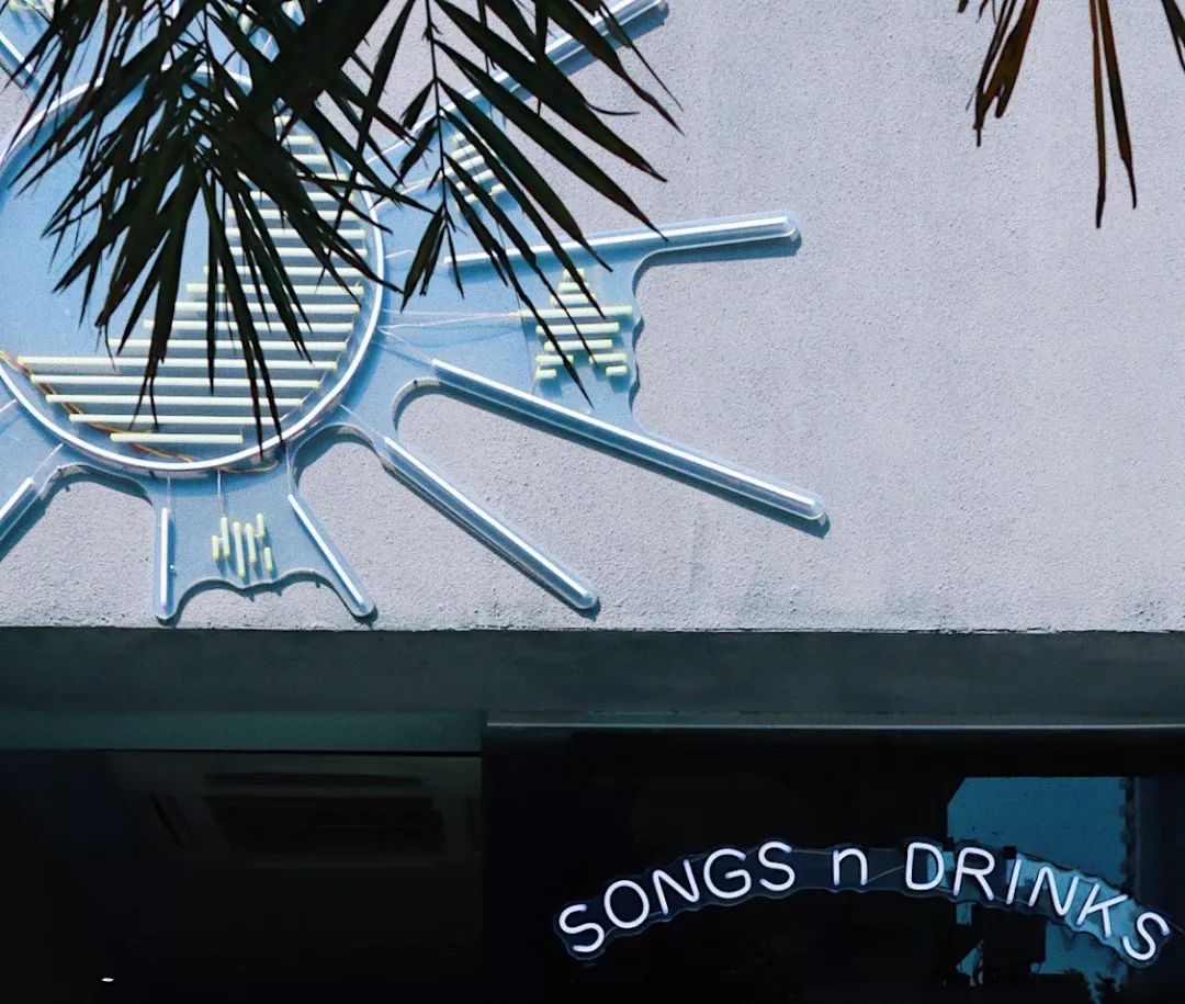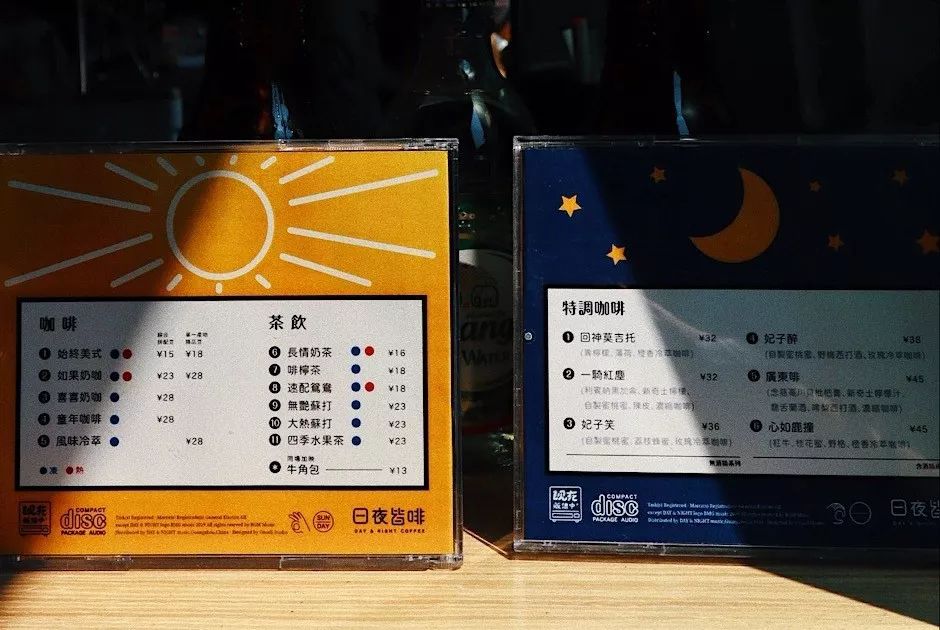 室内空间是切出店铺的左侧一块,几个圆拱形座位和吧台座位。有DAY / NIGHT两份菜牌,对应招牌两个不同手势D和N;做成了日夜两版的CD套模样,不知出周边时会摆什么歌进去呢?