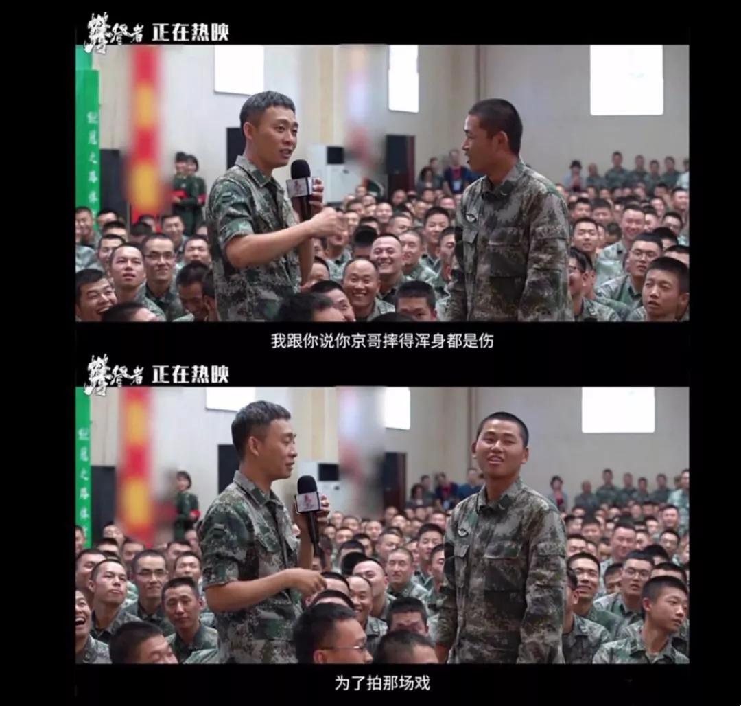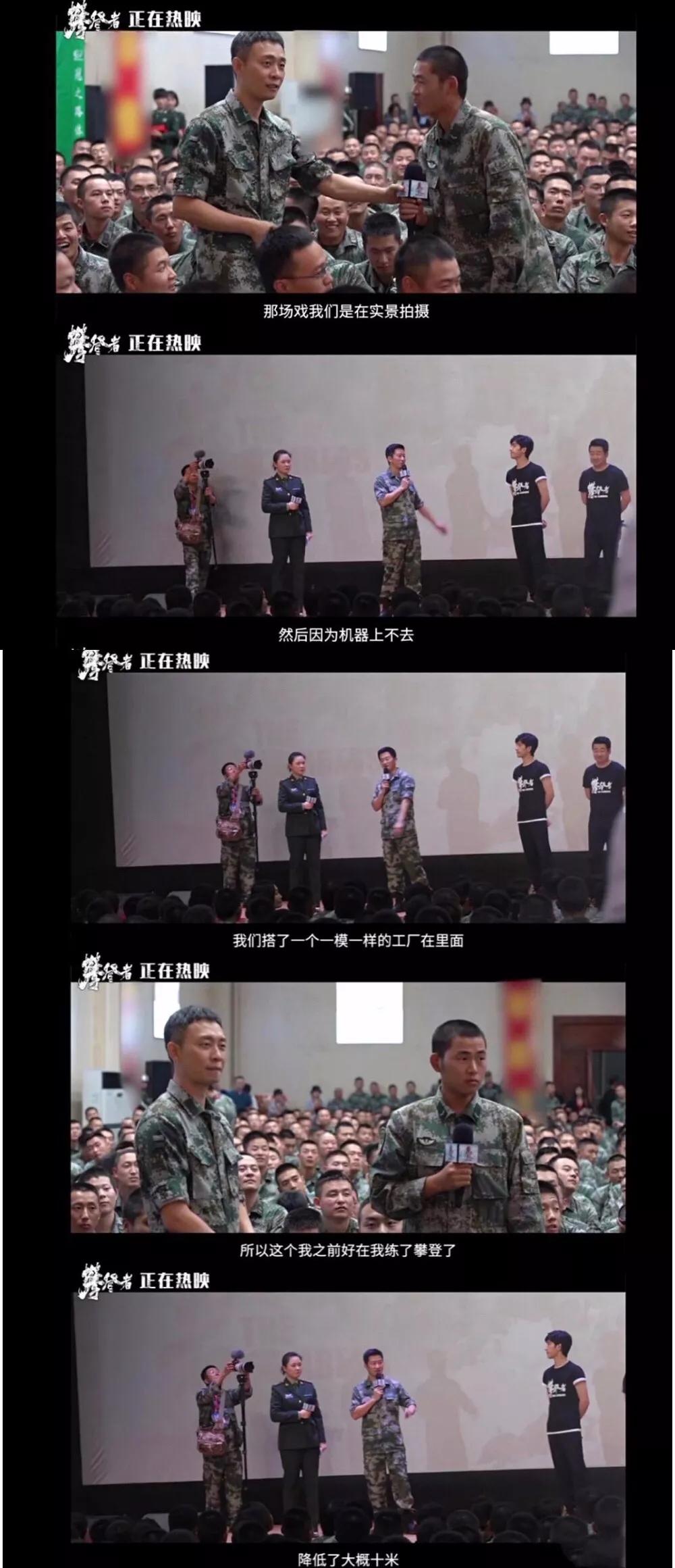 说实话呢,这个攀登的过程确实是略微浮夸了一些。但是我们细查了一下发现,吴京和张译在接受观众提问时自己说明,这个镜头并不是特效,而是在没有吊威亚,只用了一根安全绳的情况下全程实拍出来的。吴京甚至为了这场戏摔出了一身伤。