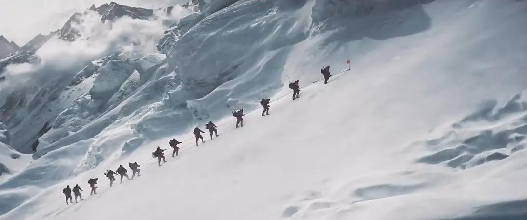 影片整体采用经典的三幕剧结构,避免了剧情上拖泥带水:第一幕讲述第一次登山摄影机丢失的遗憾,为之后的情节铺垫;第二幕登山队经历高强度训练以及两次损兵折将的挫折;第三幕登山队抓住最后的窗口期,克服极端天气成功登顶。两个小时的电影剧情安排紧凑,高潮迭起。
