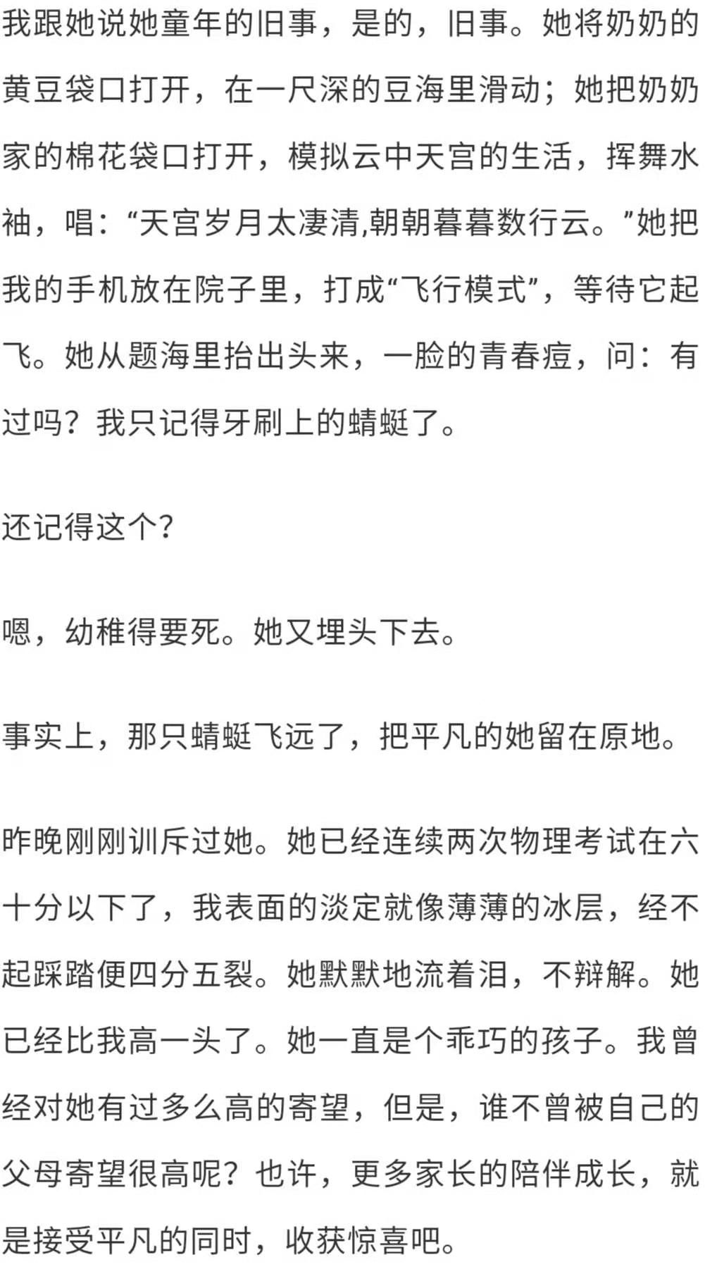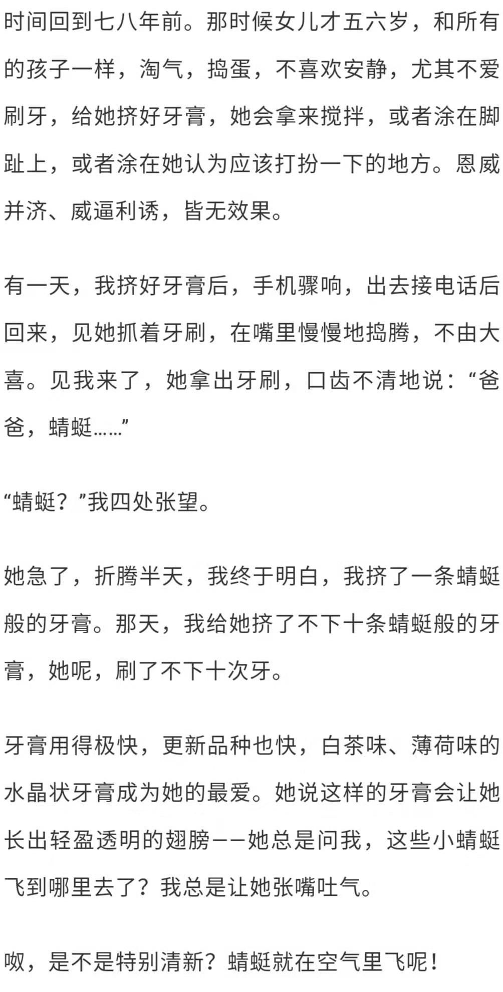 小时候的女儿淘气捣蛋,不爱刷牙。有次我挤出蜻蜓般的牙膏,她才开始乖乖地刷牙。从此,“牙刷上的蜻蜓”便成了父女间的秘密游戏。女儿慢慢长大了,蜻蜓飞远了,把平凡的她留在原地。无论女儿是天才还是凡人,她都是我心尖上的蜻蜓。