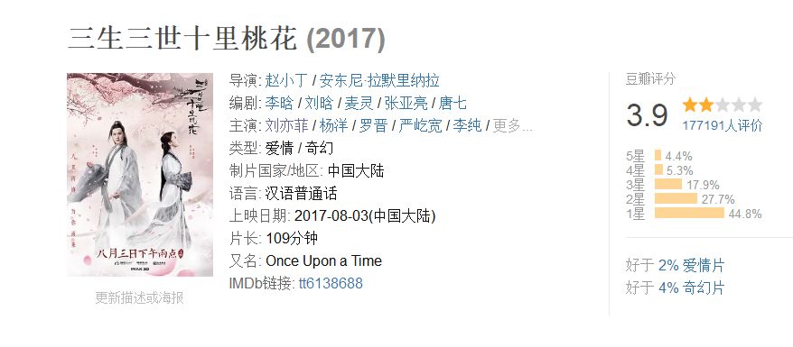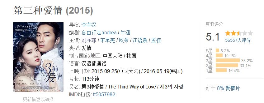 而这之后,刘亦菲虽然也交出了不少作品,但都是一些质量堪忧的狗血爱情戏,比如15年跟前男友宋承宪拍的《第三种爱情》,评分没及格,四星五星都是冲颜值去的了~