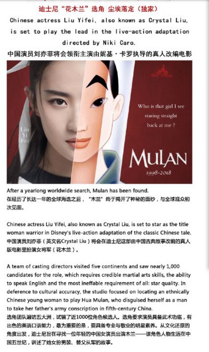 当初迪士尼宣布开拍真人版《花木兰》并进行全球海选,角色要求具备武术功底,英语流利,具备专业和敬业的明星素养。