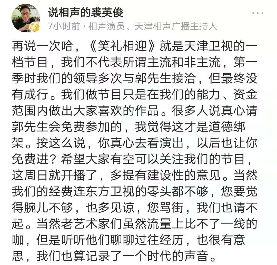 再说一次哈,《笑礼相迎》就是天津卫视的一档节目,我们不代表所谓主流和非主流,第一季时我们的领导多次与郭先生接洽,但最终没有成行。我们做节目只是在我们的能力、资金范围内做出大家喜欢的作品。很多人说真心请郭先生会免费参加的,我觉得这才是道德绑架。按这么说,你真心去看演出,以后也让你免费进?希望大家有空可以关注我们的节目,这周日就开播了,多提有建设性的意见。当然我们的经费连东方卫视的零头都不够,您要觉得腕儿不够,也多见谅,您骂街,我们也请不起。当然老艺术家们虽然流量上比不了一线的咖,但是听听他们聊聊过往经历,也很有意思,我们也算记录了一个时代的声音。