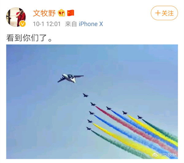10月1日,国庆阅兵仪式时,文牧野的微博截图。