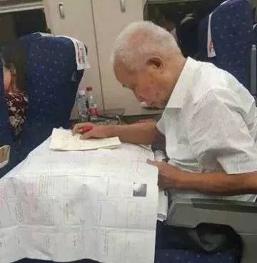 在高铁二等座上,一位白发苍苍的老人,穿着破旧的鞋,在研究图纸。