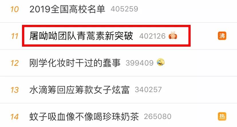 今天,屠呦呦团队青蒿素的新进展上了热搜: