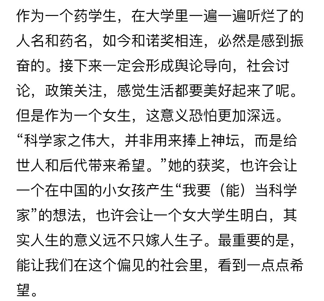 而屠呦呦的存在,这些默默无闻、籍籍无名却真正改变这个时代、担起民族脊梁、扛起国家未来的人,也许给了我们关于人生的另一种答案。