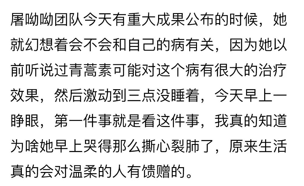 今天屠呦呦团队的新进展,不仅仅是一项研究成果,也不仅仅是为了奖项去做的努力,对于很多人来说,那是他们的生命和希望。