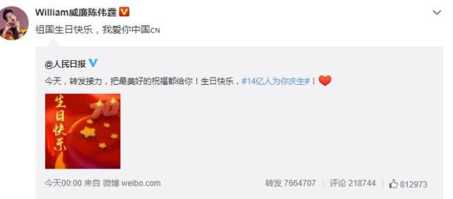 而像陈伟霆,佘诗曼这两位长期在内地发展的香港明星也是早早的就转发了相关文章,祝福祖国繁荣昌盛