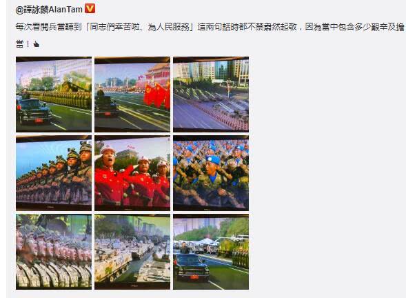 此外,著名歌星谭咏麟,甚至还全程收看了盛大的阅兵仪式,并且称每次看到这样的军容军姿,他本人都会肃然起敬。相信很多网友都会有这样的体会吧。
