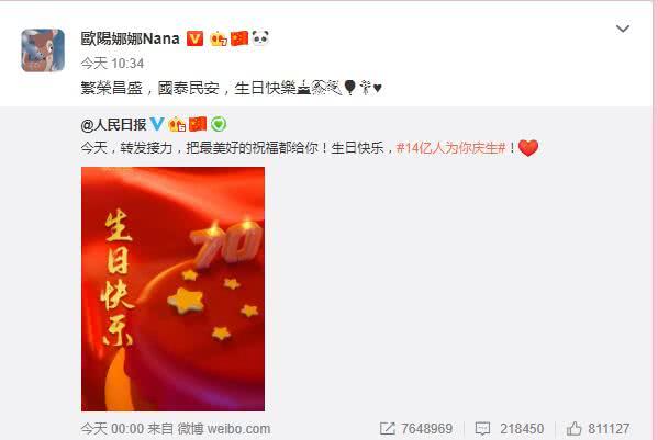除了香港艺人纷纷发文表态之外,台湾明星的举动更是让人敬佩不已。最具有代表性的就是欧阳娜娜了,虽然生在台湾,但是欧阳娜娜的爱国情操可是相当不一般的。在阅兵仪式开始之后,欧阳娜娜就发表了文章,祝福祖国生日快乐。这样明确的表达自己立场的做法,也是非常值得肯定。