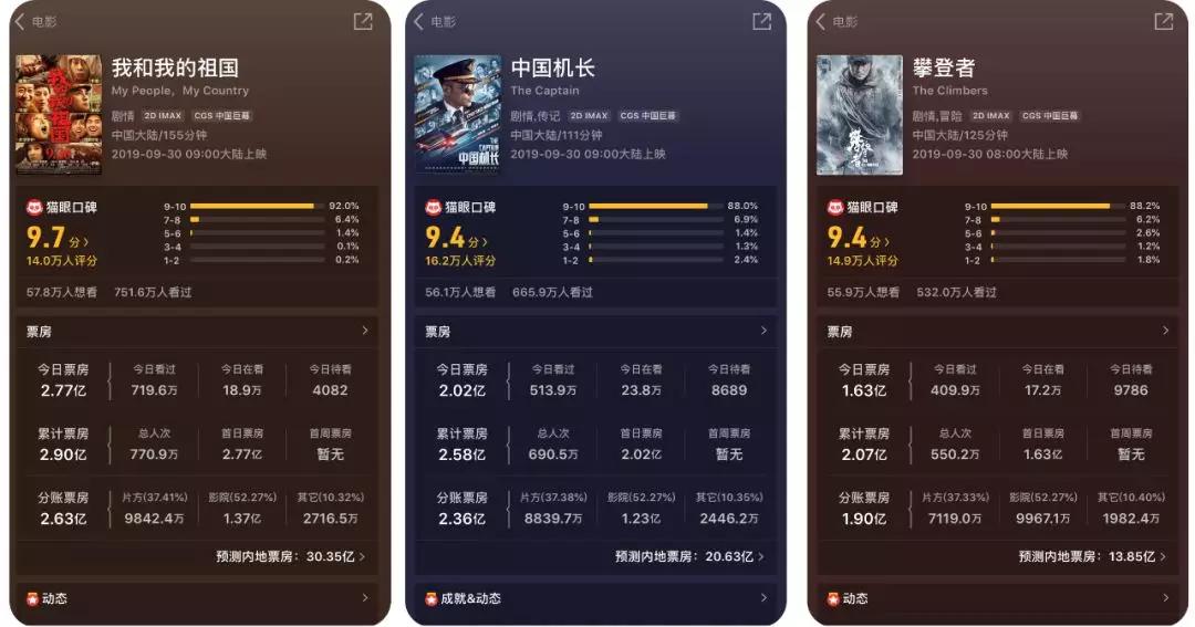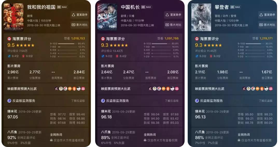 鉴于今年的国庆档过于特殊,因此在各个层面上都不同以往,这一点从三部影片的口碑评分就可以窥得一二。三部影片均取得了非常好的口碑,《我和我的祖国》猫眼9.7分,淘票票9.5分。《中国机长》猫眼9.4分,淘票票9.3分紧随其后。《攀登者》猫眼9.4分,淘票票9.3分,同样是一个非常好的成绩。