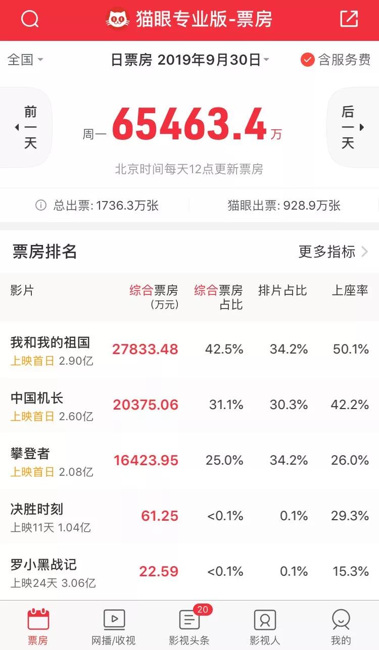 《我和我的祖国》首日2.9亿,《中国机长》首日2.6亿,《攀登者》首日2.08亿,9月30日拿到6.5亿,数据已经在证明,这是史上最佳国庆档。