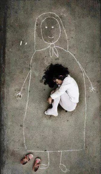这个孤儿院的孩子就在地板上画了一个妈妈,想像着,在妈妈温暖的怀里睡着了。