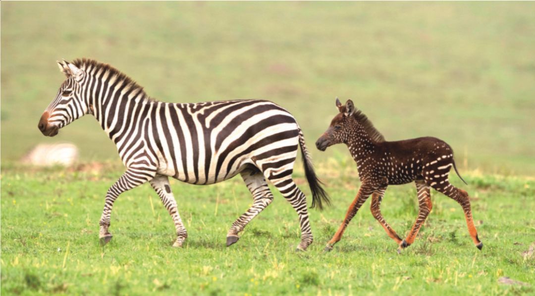 肯尼亚马赛马拉,摄影师拍到一只斑马和她的斑点马孩子。他不清楚,到底出了什么事情,孩子的肤色与妈妈差异如此之大。不过世事经常如此,常能给人们以精细和意外——但愿小马的爸爸也这样想。(IC 图)