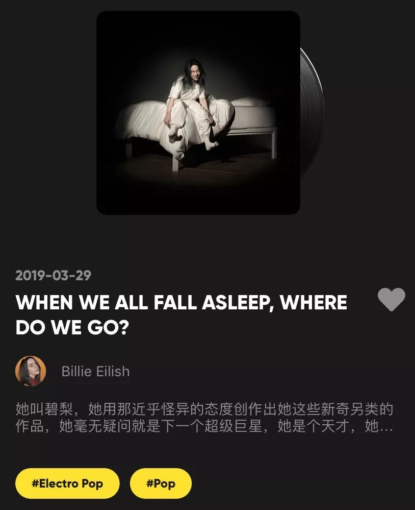 碧梨的首张个人专辑《WHEN WE ALL FALL ASLEEP,WHEREDO WE GO》一经发布,就登顶60多个国家的iTunes冠军。