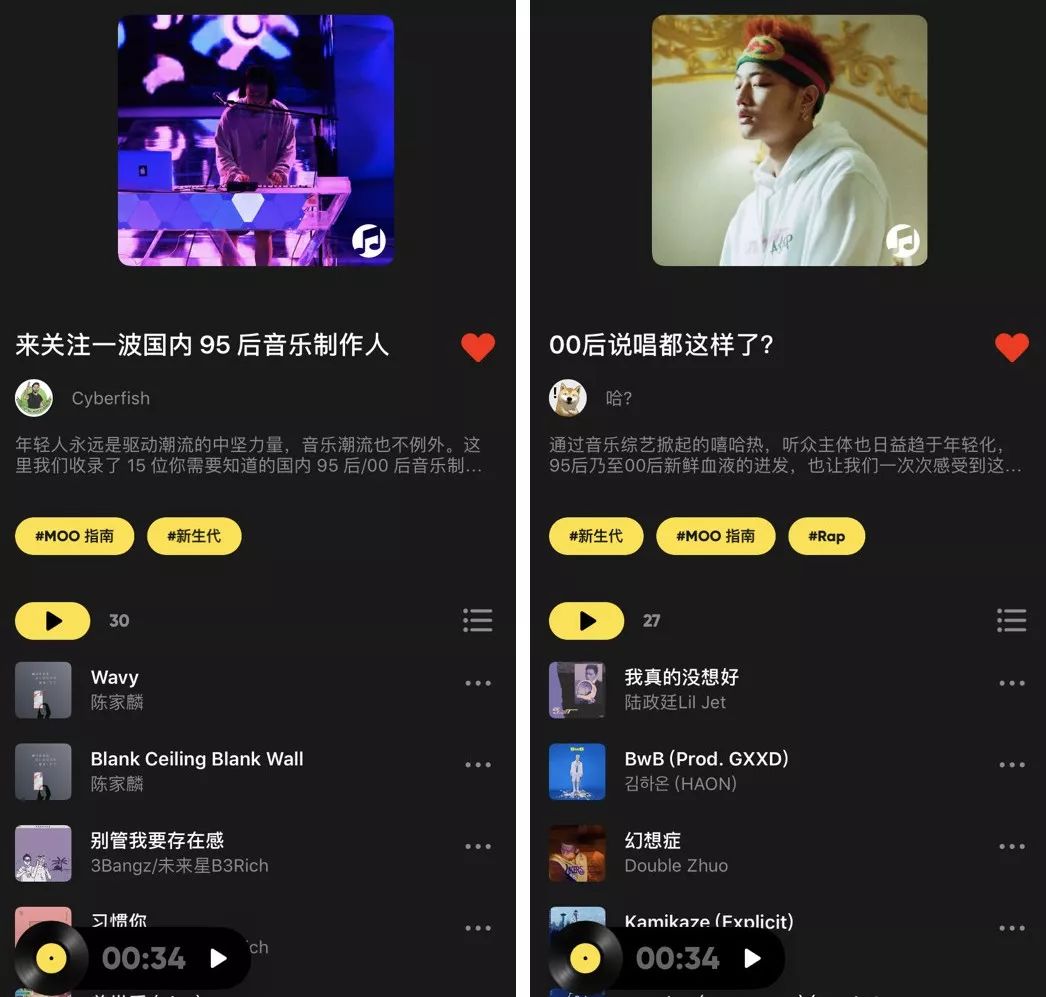 除了碧梨,我还通过MOO音乐的标签和推荐歌单,发现了一些特别有意思的00后歌手以及95后音乐制作人,或许华语乐坛的碧梨就会从他们中出现呢?▼