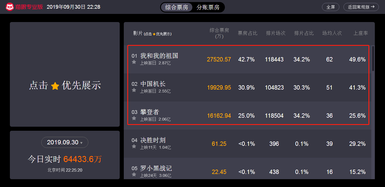 在截止发稿时间,根据猫眼专业版实时票房数据显示,国庆档“三杰”上映首日票房如下:《我和我的祖国》以累计总票房破2.8亿元问鼎榜首;《中国机长》以2.5亿元紧随其后位列榜单第二;《攀登者》以2.0亿排在榜单第三。