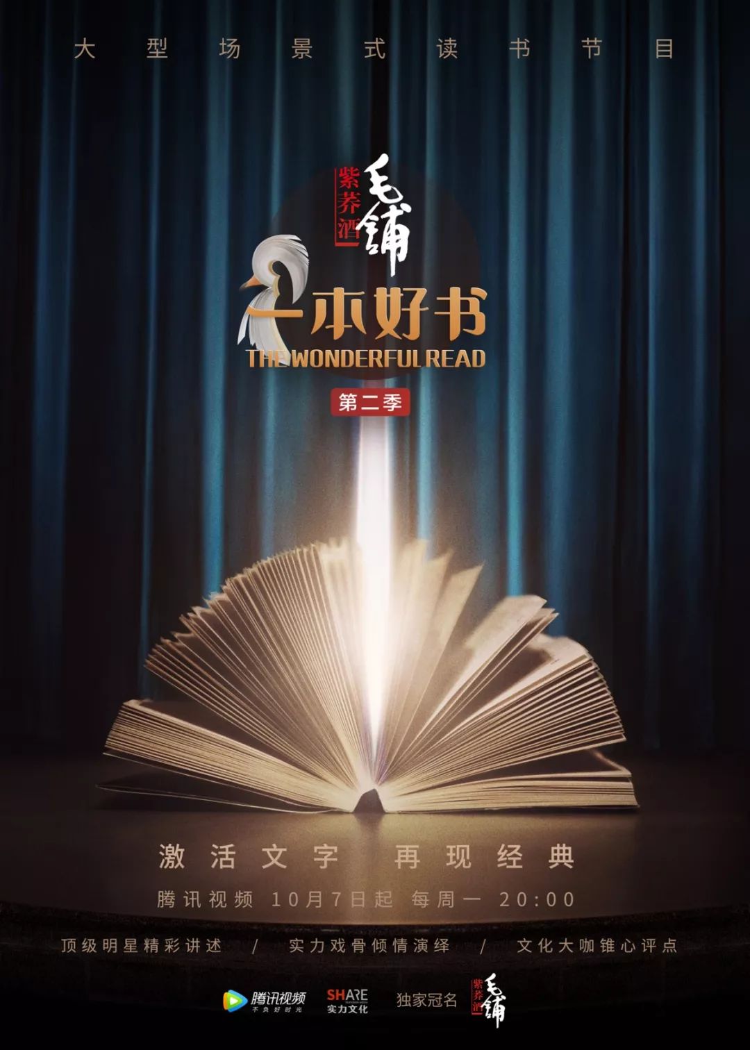 真人秀《一本好书》第二季官宣,将于10月7日起,每周一20:00在腾讯视频上线播出。本季的嘉宾包括王劲松、周一围、喻恩泰等明星。《一本好书》用舞台表现的形式搭建书中场景,同时将经典书目中的情节冲突、人物性格等细节,通过演员的表演演绎出来,带给观众沉浸式的观看体验。