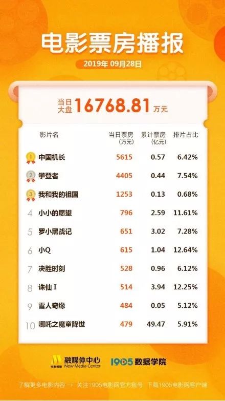 献礼片点映票房出炉,根据1905电影网统计数据显示,9月28日,国庆档三部献礼片同日开启点映,大盘报收票房1.68亿元,较前一日上涨259.16%。中国机长点映首日票房5615万,登顶单日票房冠军;攀登者点映首日票房4405万,位居亚军。#我和我的祖国#排片占比仅为0.68%,但凭借超过90%的上座率,票房突破千万。三部影片以极高的热度助推大盘上涨,提前拉开了国庆档期的帷幕。