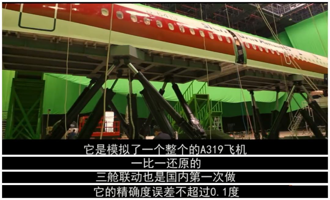 剧组一比一制作出A319飞机,第一次做出完整的三舱联动,精确度误差不超过0.1度。