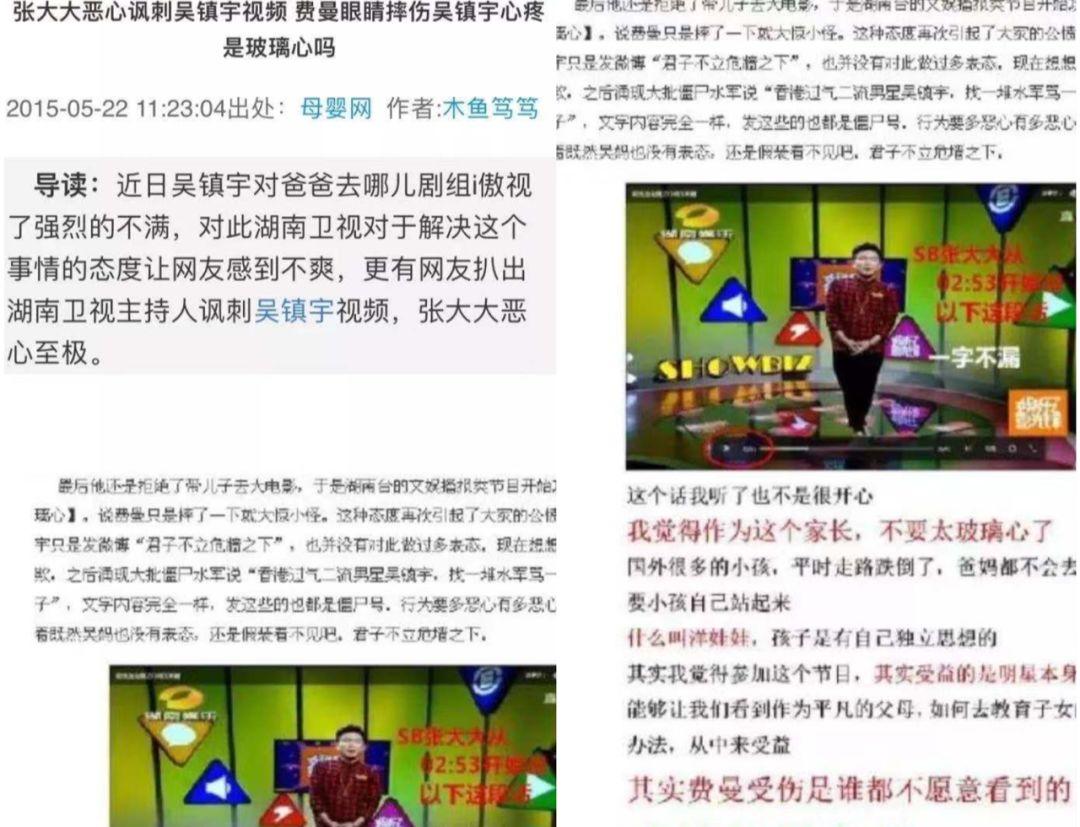 当年《爸爸去哪儿》的费曼受伤事件闹得沸沸扬扬,节目中费曼眼睛被撞缝针,视力被判断为受到永久性伤害。然而张大大在芒果台的一档娱乐播报节目中轻描淡写了来一句“家长不要太玻璃心”。