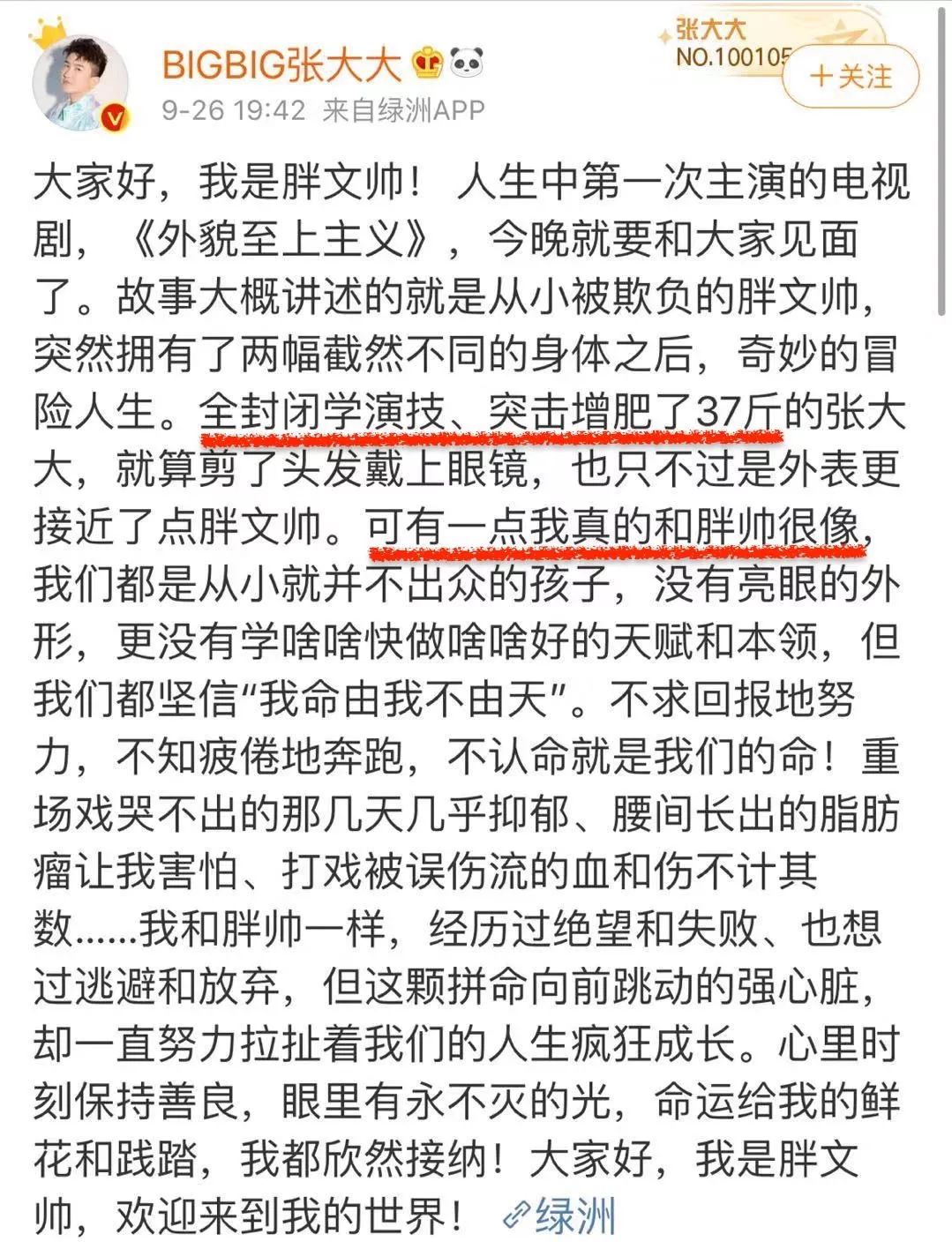 据说为了拍这个戏,张大大封闭练习学演技,还增肥37斤。他还在微博中透露,他和主角一样,几乎有着类似的自卑,但他也和主角一样从没认命。