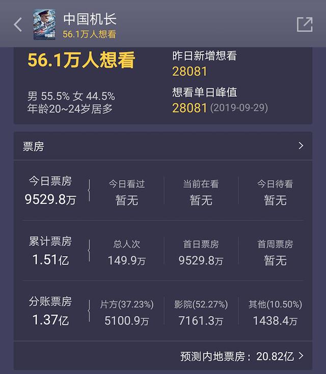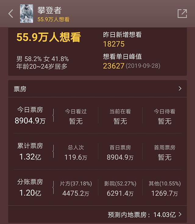同时,猫眼平台也给出了预测票房,其中《我和我的祖国》高达35.17亿,《中国机长》达到了20.82亿,而观众们期待很高的《攀登者》只有14.03亿,排在了第3位。